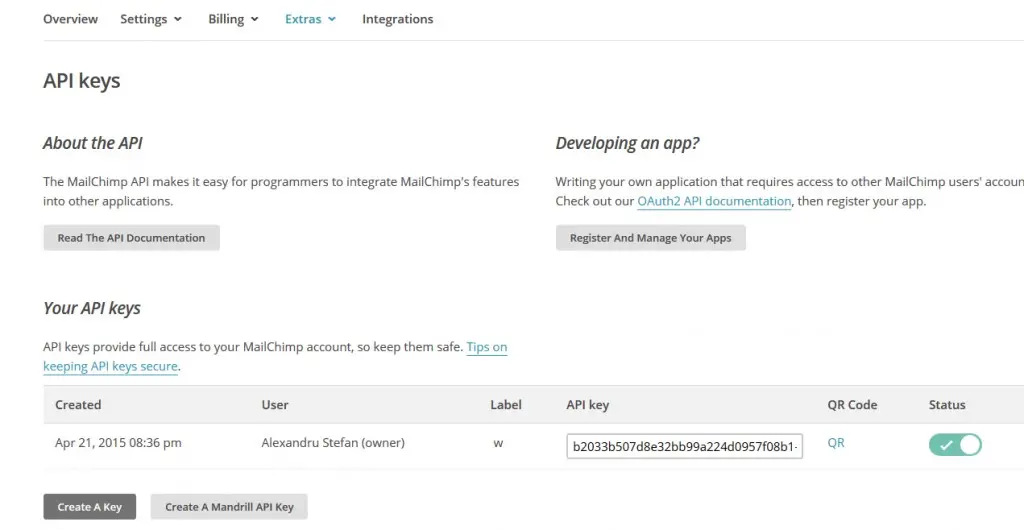 1. While logged in MailChimp, go to Account Setings (top right), expand the Extras area, and click "API Keys".