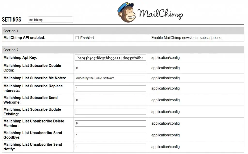 Integrating your MailChimp account is easy! Just generate an API Key from MailChimp, and copy & paste that into your ClinicSoftware.com settings.